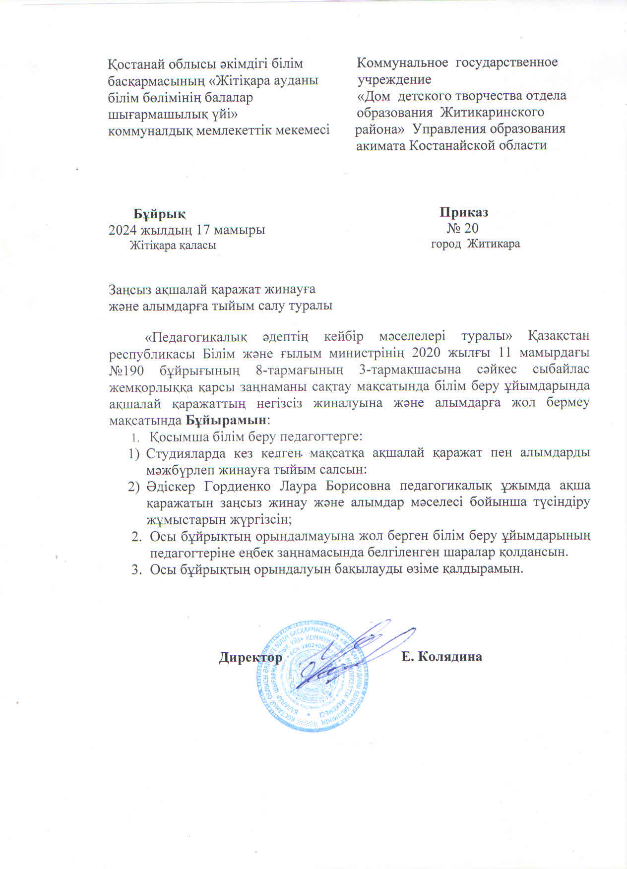 Бұйрық №20 "Заңсыз ақшалай қаражат жинауға және алымдарға тыйым салу туралы"